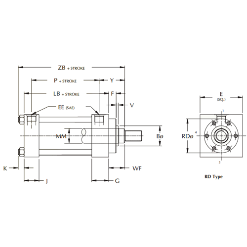- Construction: Square steel head and cap, steel barrel tubing with polished i.d., tie rod assembled, removable bronze cartridge type gland bushing.